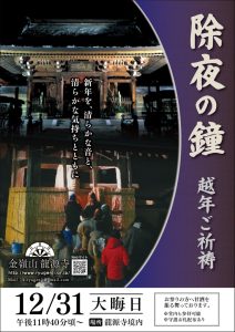 除夜の鐘ポスター 令和7年12月23日 一覧へ 除夜の鐘/越年ご祈祷 次回行事予定 年間山内行事を見る 令和8年1月行事予定 1~3日 三箇日祝祷 7日 七草 11日 蔵開き 15日 祝祷日 17日 17世正当 23日 9世正当 26日 先住忌 ※遠州流茶道教室 22日予定 (2回目は未定となっております) 遠州流茶道 龍源寺教室 檀家さん対象: すべての方対象: 金嶺山 龍源寺